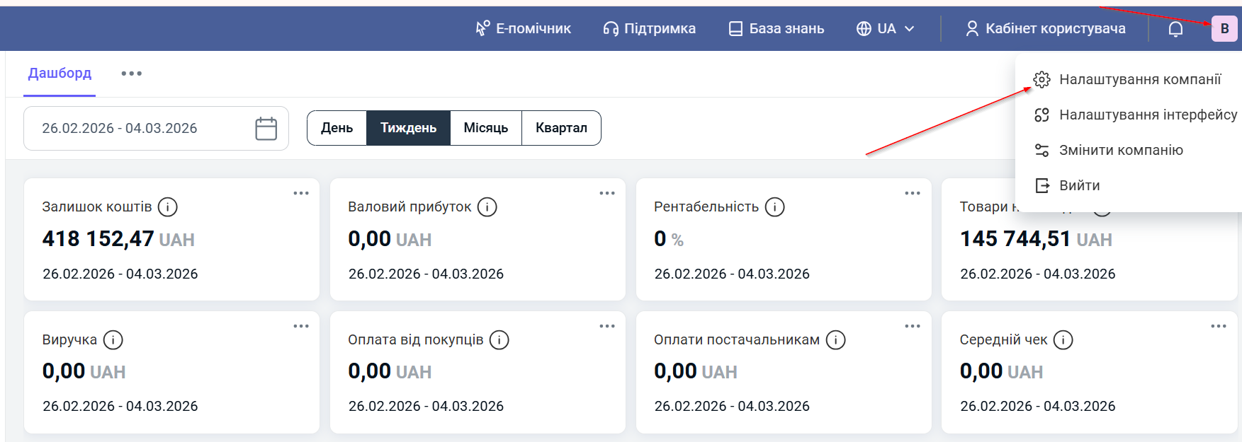 🔹Натисніть на іконку профілю у верхньому правому куті екрана та виберіть розділ "Налаштування компанії".
